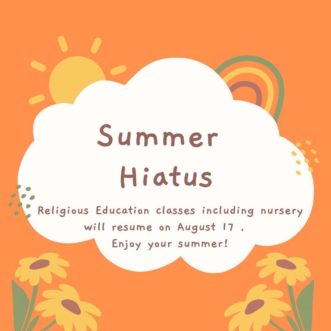 All religious education classes including the nursery will be on hiatus from July 6 through August 3. We will return on August 10 with an experiential worship service and then faith filled fun days for the remainder of August.